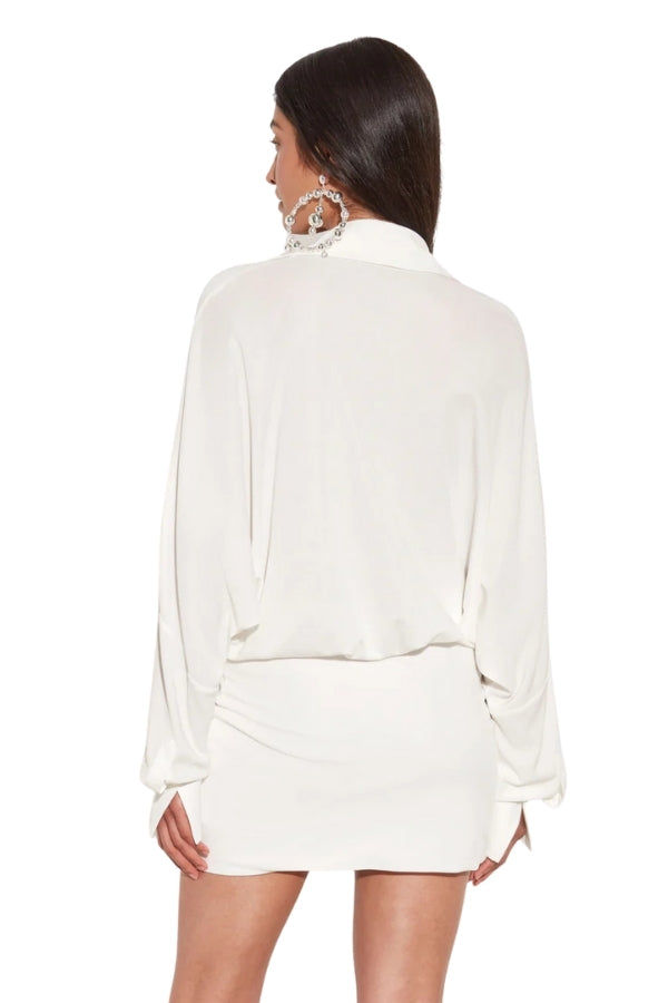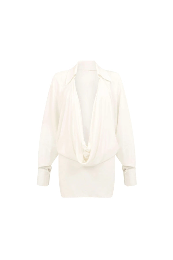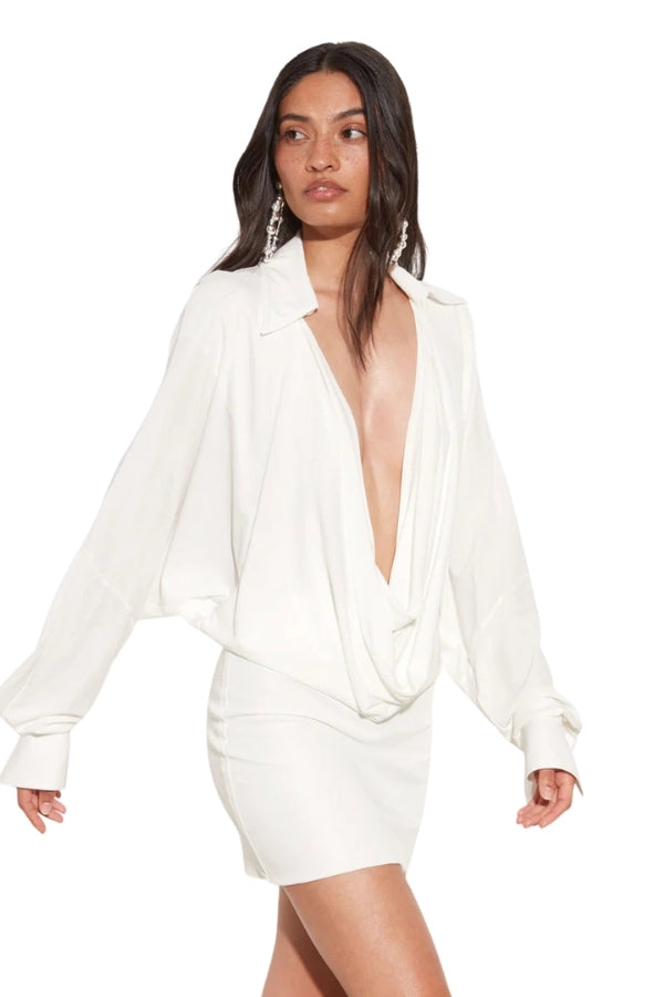 Mini hemline = maximum impact. Stella is our flawless, white hot mini dress. We love the contrast of sharp collar and fluid cowl neck.