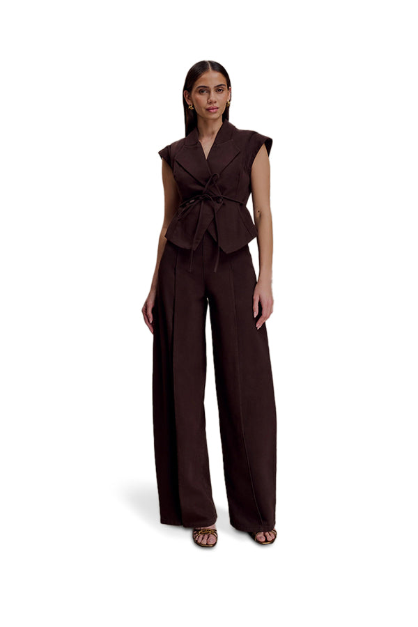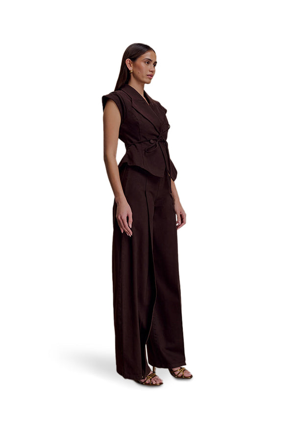 The CHARLEY Structured Tie Denim Top is cut with directional detailing for a sculpted finish. Designed with an asymmetric lapel neckline and cap sleeves, it frames the silhouette with modern edge. A wrap-style shape cinches at the waist with a back tie, while the button closure adds a polished touch. Fully lined for comfort, this top balances sharp tailoring with feminine definition—perfect styled with denim or tailored separates.