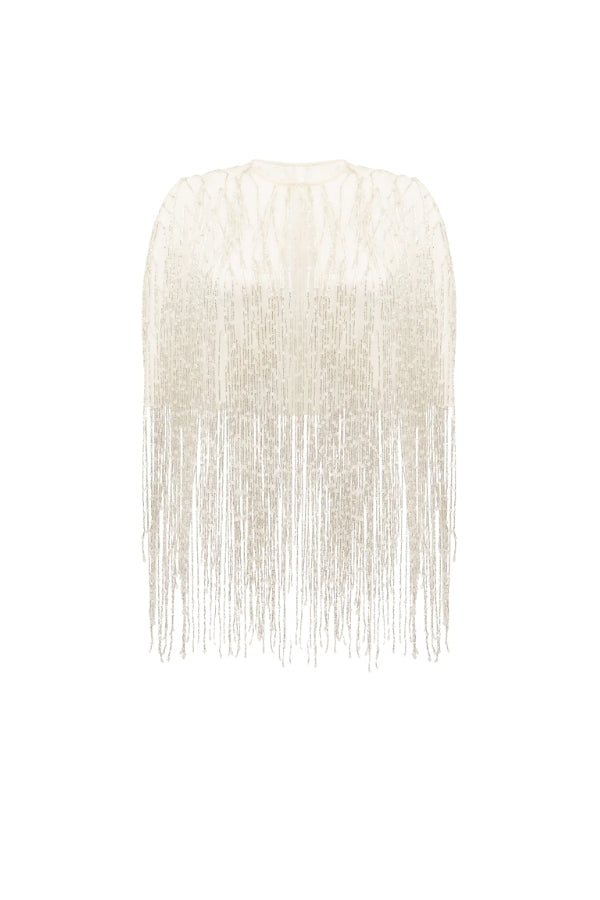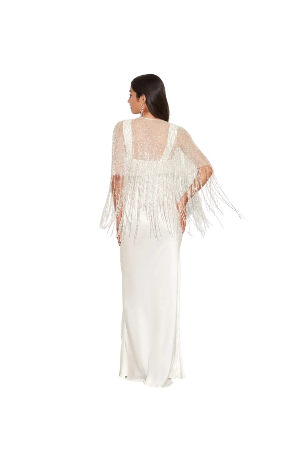 Embellished by hand with thousands of twinkling silver bugle beads, our short Josephine cape is layered over net so it feels soft against the skin. As light as air, it moves and shimmers in the light.