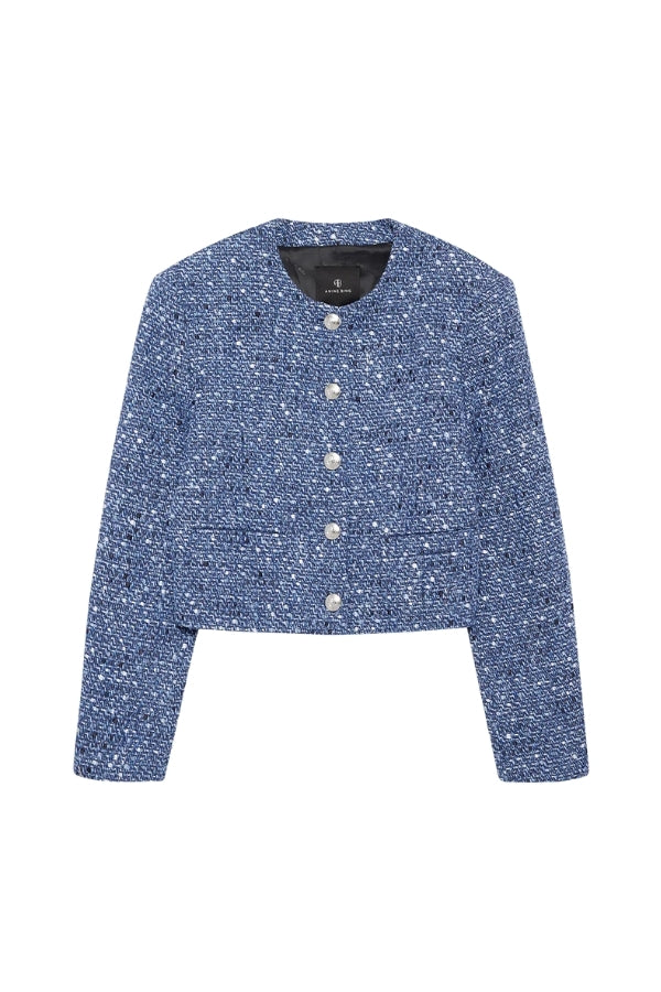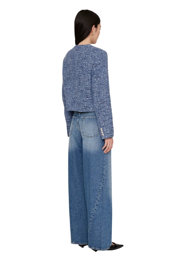 The Amber Jacket is crafted from a light-to-midweight cotton tweed blend in a denim blue colorway. Intended to be dressed up or down, this versatile-yet-luxurious layer features two functional welt pockets and a sleeve placket at each cuff. Finished with decorative antique silver buttons with ANINE BING engraving at the center front for an elevated look.