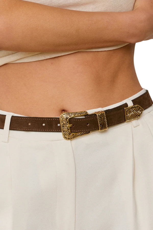From the Heritage Collection—Handcrafted in Italy from full-grain Italian soft suede leather, featuring a custom molded western designed buckle, loop and tip finished in 24k gold tone