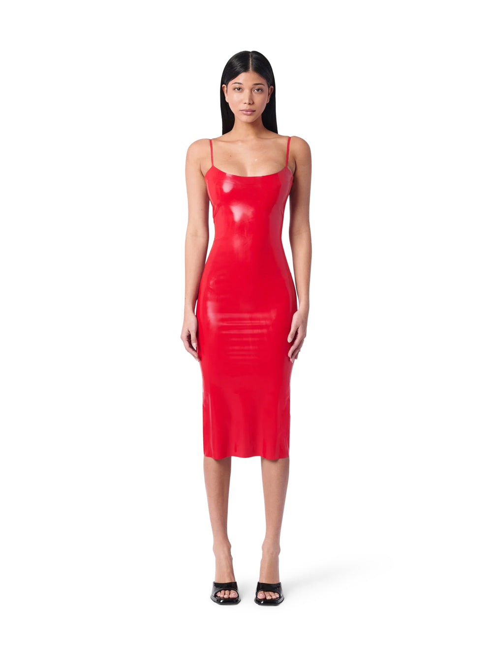 The Whistle Dress is a sexy, sultry, show-stopping piece. Sculpted to hug the body, this midi latex dress is the perfect blend of sexy and sophisticated. Features a centre back leg slit and adjustable spaghetti-straps and low scoop neckline. Ultra shine midi dress