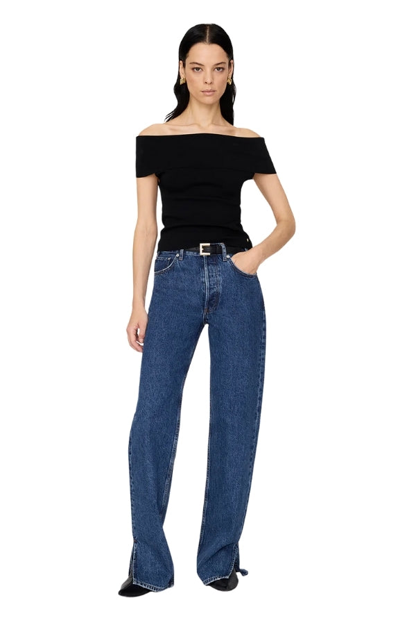 The Francis Top is a flattering, off-the-shoulder style made from a dense viscose-nylon knit fabrication.