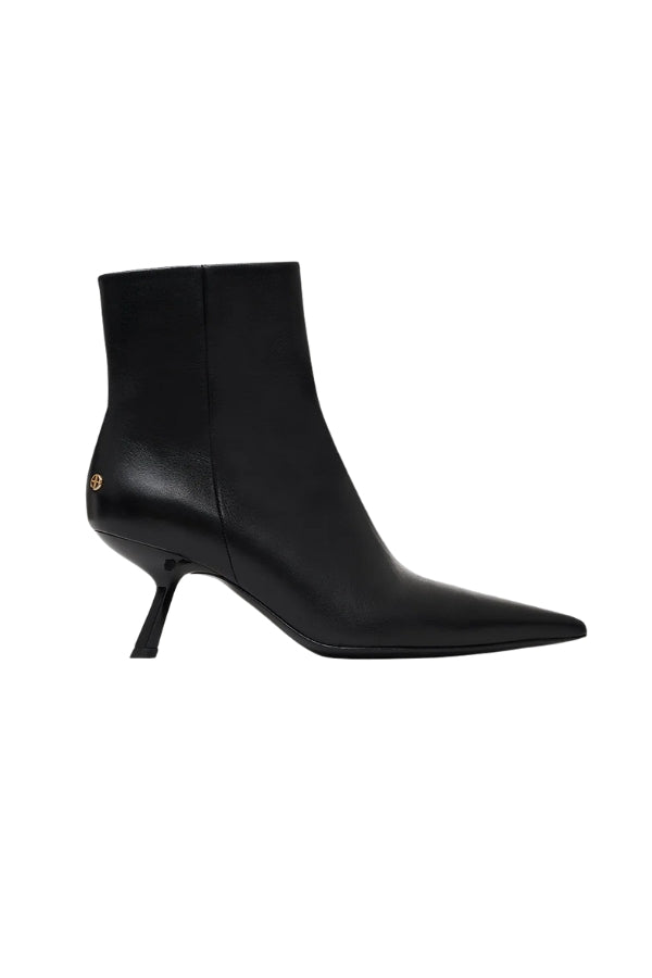 Modern sock booties made from 100% cow leather in a slight sheen. The Hilda Boots' sleek construction features a sharp pointed toe, low slanted heel, and high-shine outsole. Accented with gold-tone ANINE BING hardware at each heel.
