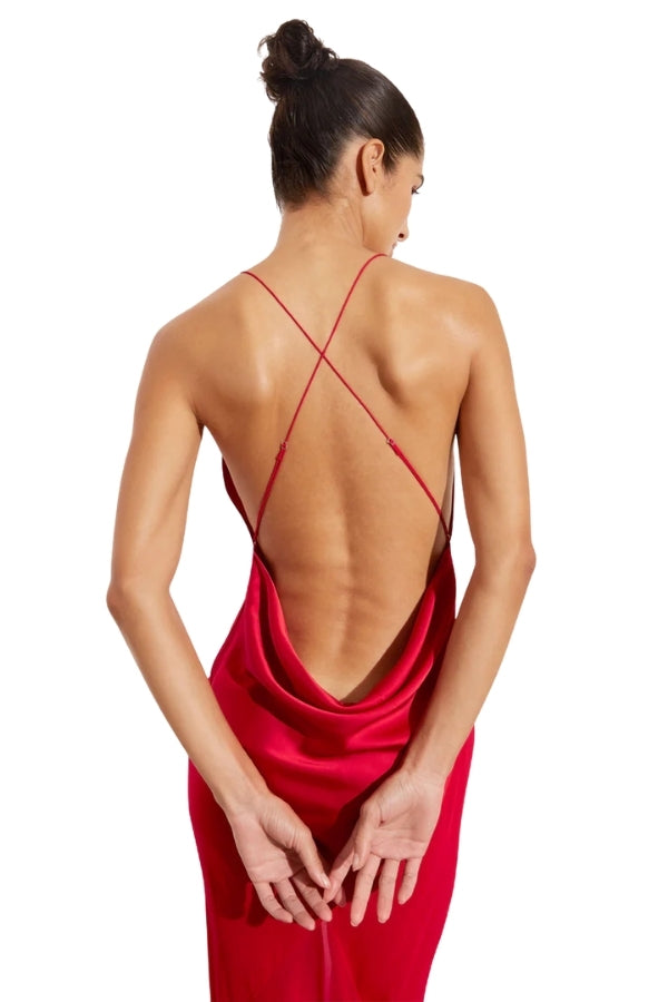 Timeless with a twist. Lotus is our clean and serene red slip dress with sheer diamond mesh panel and criss-cross back straps.