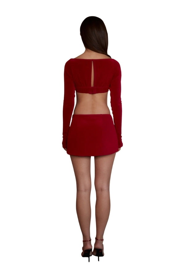 An underwire cropped long sleeve top featuring a keyhole detail at the center front with an underwire, a hook-and-eye closure at the back. It has a grosgrain pattern, elastic at the back hem, plush underwire casing, and elastic at the interior neckline and armholes for added comfort.