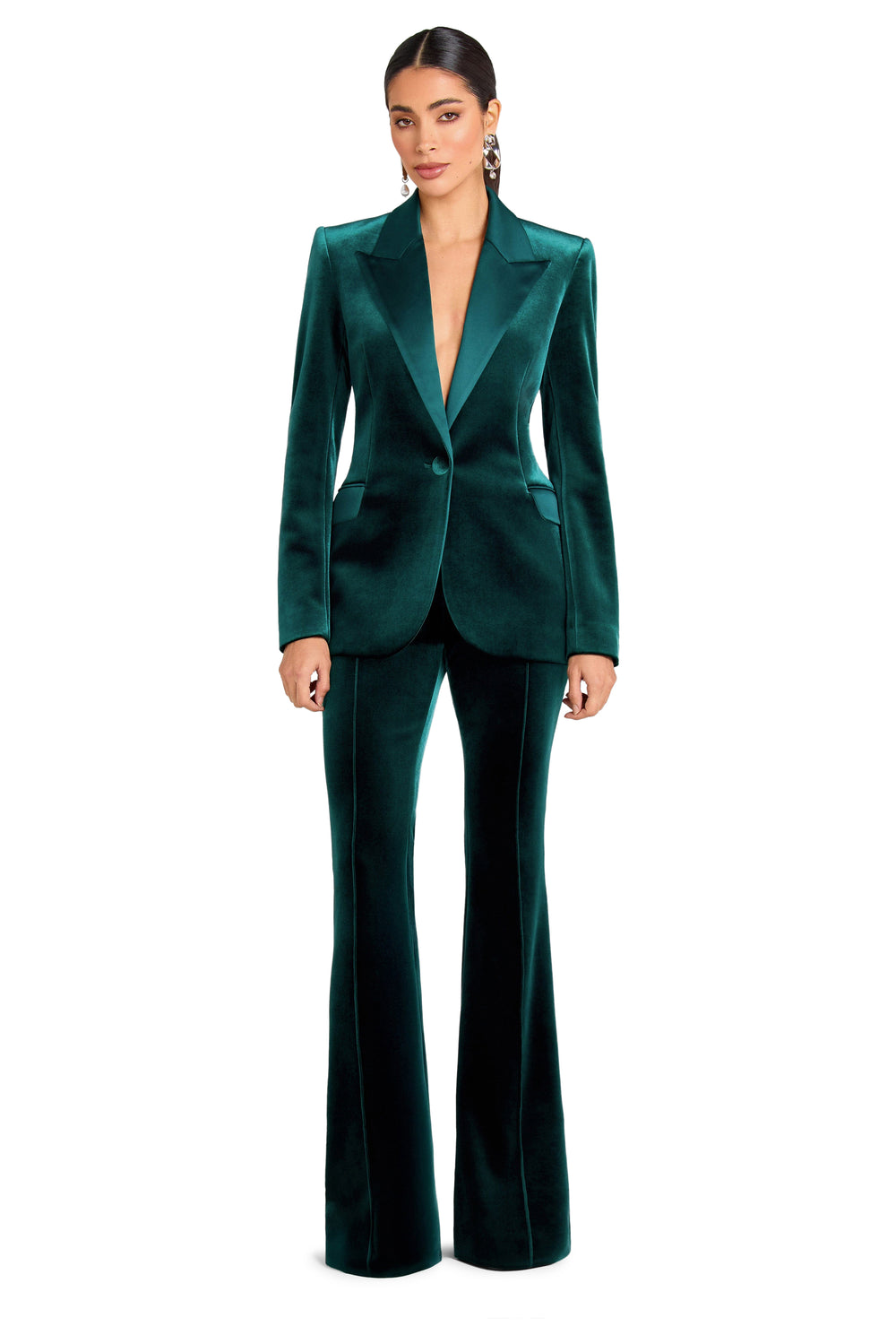 The BEATRICE blazer is crafted from luxurious green velvet and features a contrasting satin lapel with subtle, non-functional pocket detailing. Designed with padded shoulders for a defined silhouette, full-length sleeves, and a single-breasted front closure, it is fully lined for a smooth, comfortable fit.