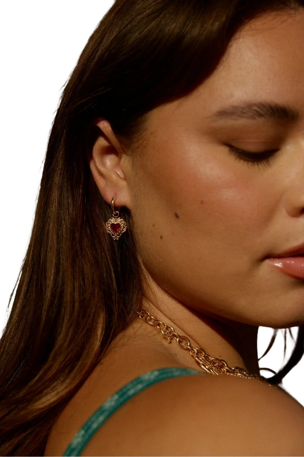 Latch back hoop closure designed for pierced ears. Baroque, heart-shaped pendant with a centred, deep red Cubic Zirconia stone.
