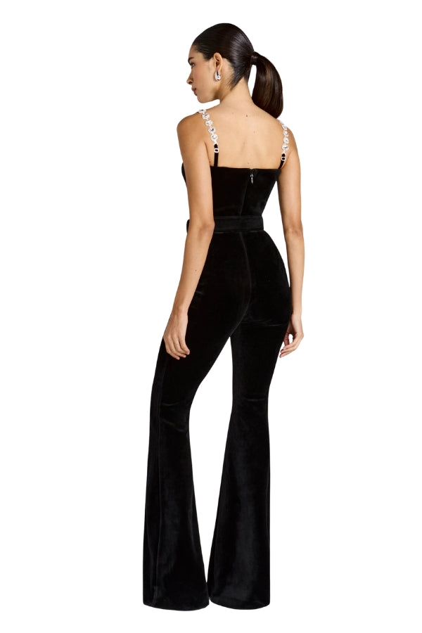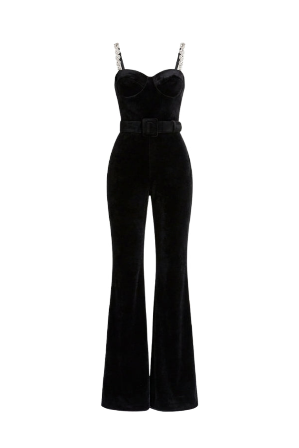 Crafted from luxurious black velvet, the HARLEY Jumpsuit features a corset-style boned bodice and signature MERABI flared-leg trousers for a cinched, sculpted silhouette. Silver detachable straps with jewel embellishments offer adaptable elegance, while a detachable velvet belt and concealed centre-back zip ensure a flawless fit.