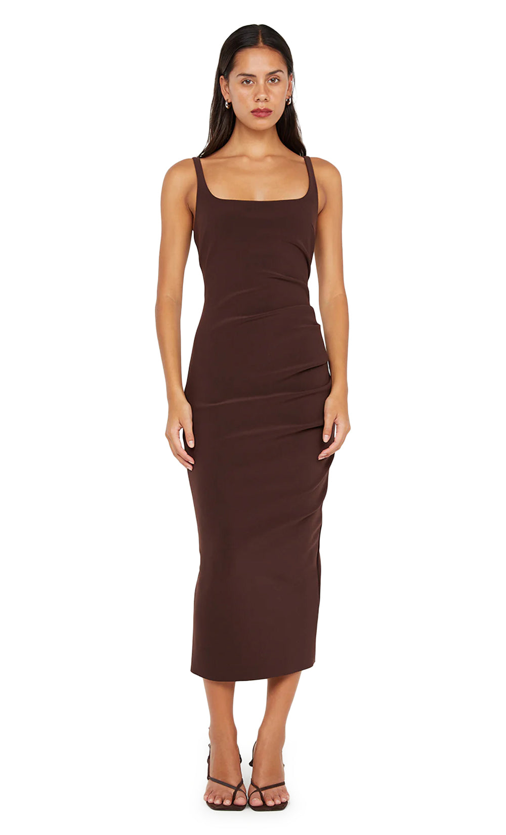 The BEC + BRIDGE Karina Midi Dress in Dark Chocolate is a timeless piece crafted from our signature bonded crepe fabric. The form-fitting midi dress features a square neckline and side tuck detailing, creating a flattering silhouette.