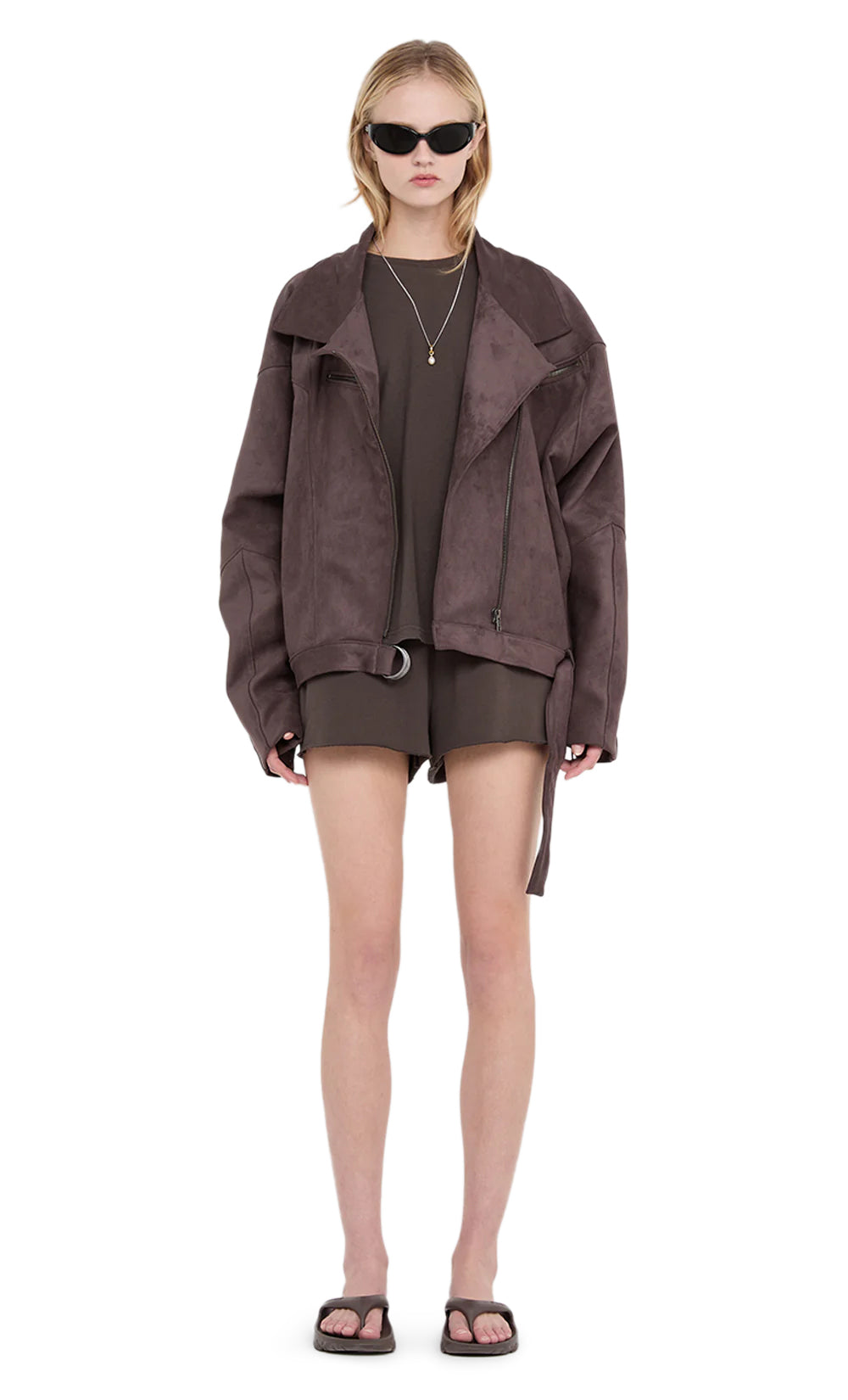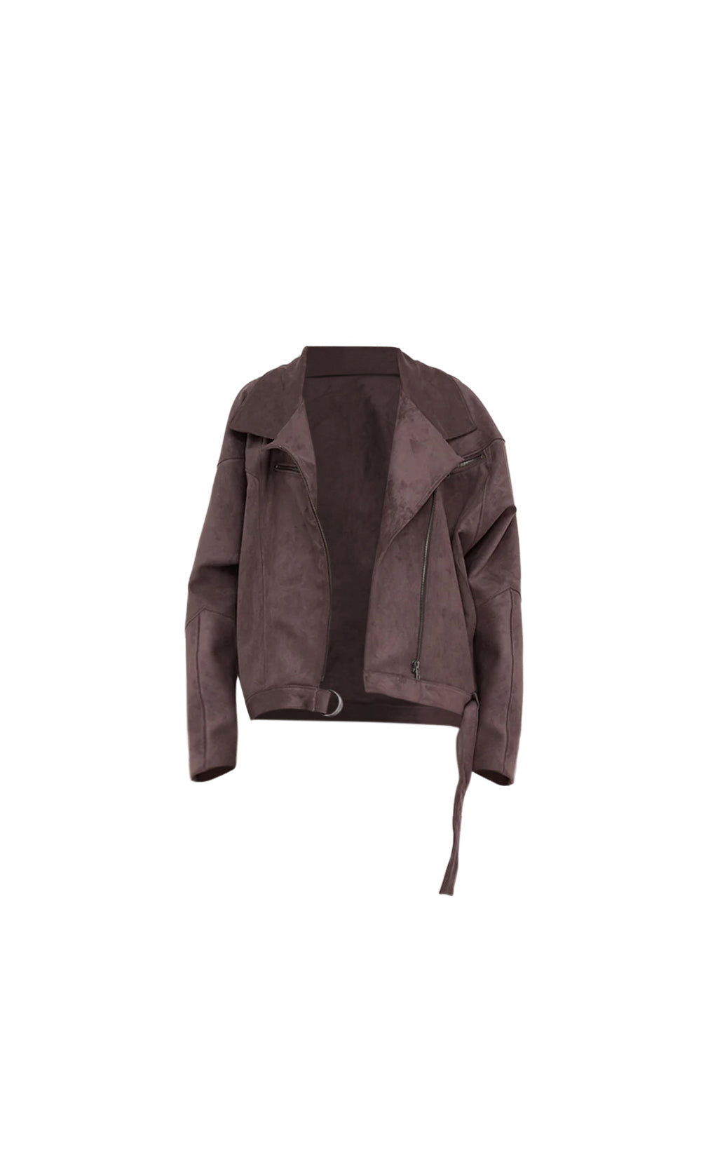 The Lyon Bomber reimagines the classic motto with a modern twist. Cut from soft faux suede with an oversized fit, it features bold batwing sleeves and an asymmetrical center-front zip closure. Industrial details like external metal zippers and a self-belt with ring hardware add structure to the fluid shape. Fully lined and equipped with deep inseam pockets, this jacket is designed for both warmth and style.