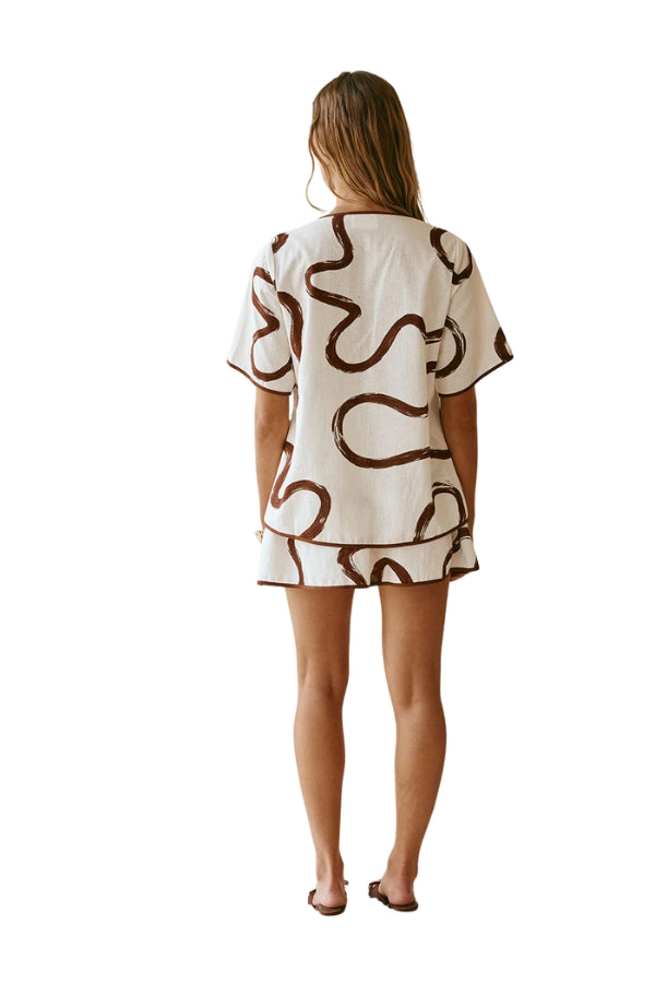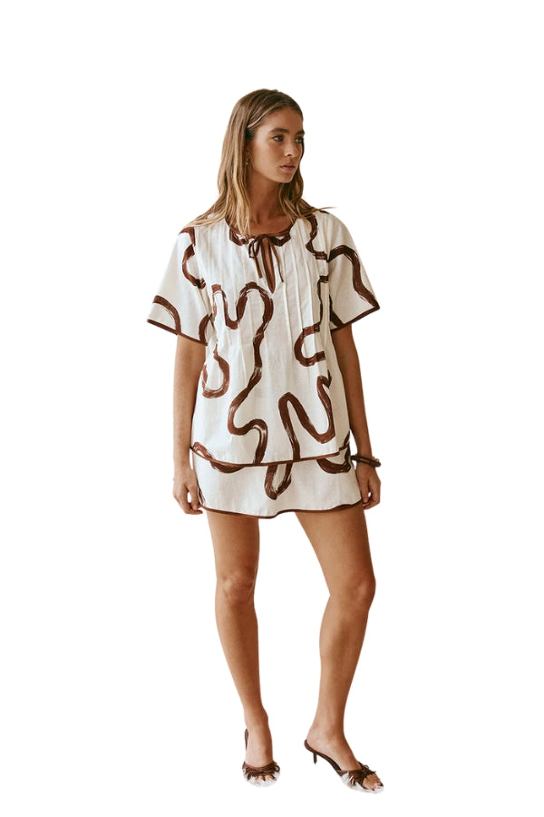 Introducing our Rayne set from our Sono Arte collection - The Rayne Top is made from a natural linen cotton blend fabric with our exclusive Marbled Mocha print. It is a relaxed fit and features contrast chocolate bind trims, split at centre neck with tie closure, short boxy sleeves, pintuck details across top and a flouncy flared hem. Designed exclusively by Sabo.