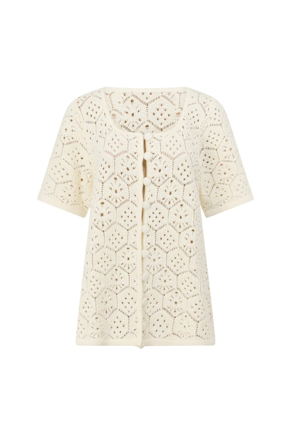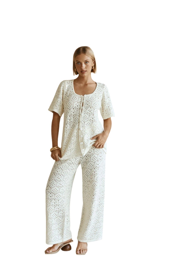 The vintage inspired Umiko Top is made from a natural cotton crochet fabric in a cream hue. It is a relaxed style featuring a scooped neckline, boxy sleeves and a button opening at centre front with covered buttons. Get the set with the Umiko Pants. Designed exclusively by Sabo.