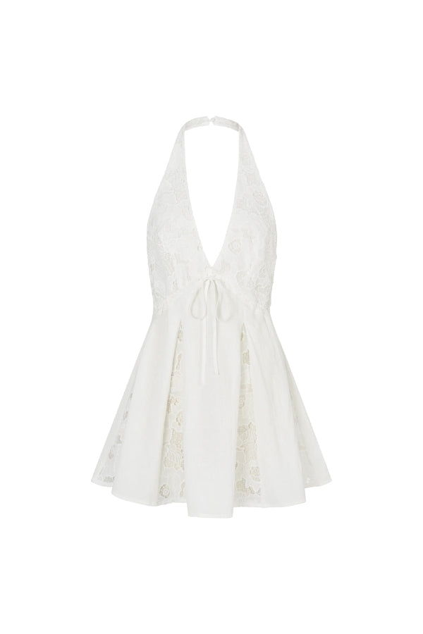 A soft embrace of femininity, Céleste weaves timeless beauty with intricate lace and floral motifs, evoking vintage romance and effortless grace. Mini dress.