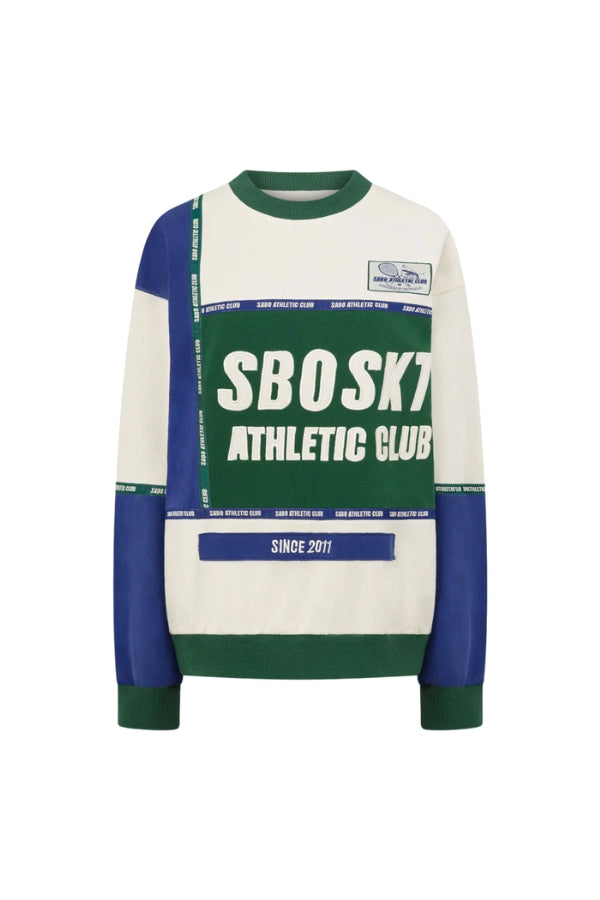 The cosy and unisex York Sweater is made from a natural cotton terry back sweater fabric in blue, green and cream hues. It is an oversized style featuring a crew neck, extra long boxy sleeves and embroidery, patch and tape detailing throughout. Designed exclusively by Sabo.