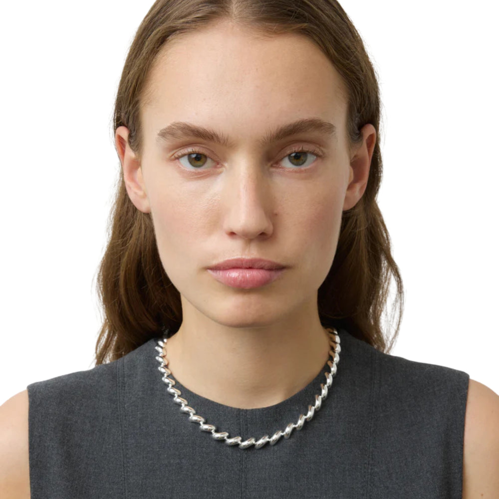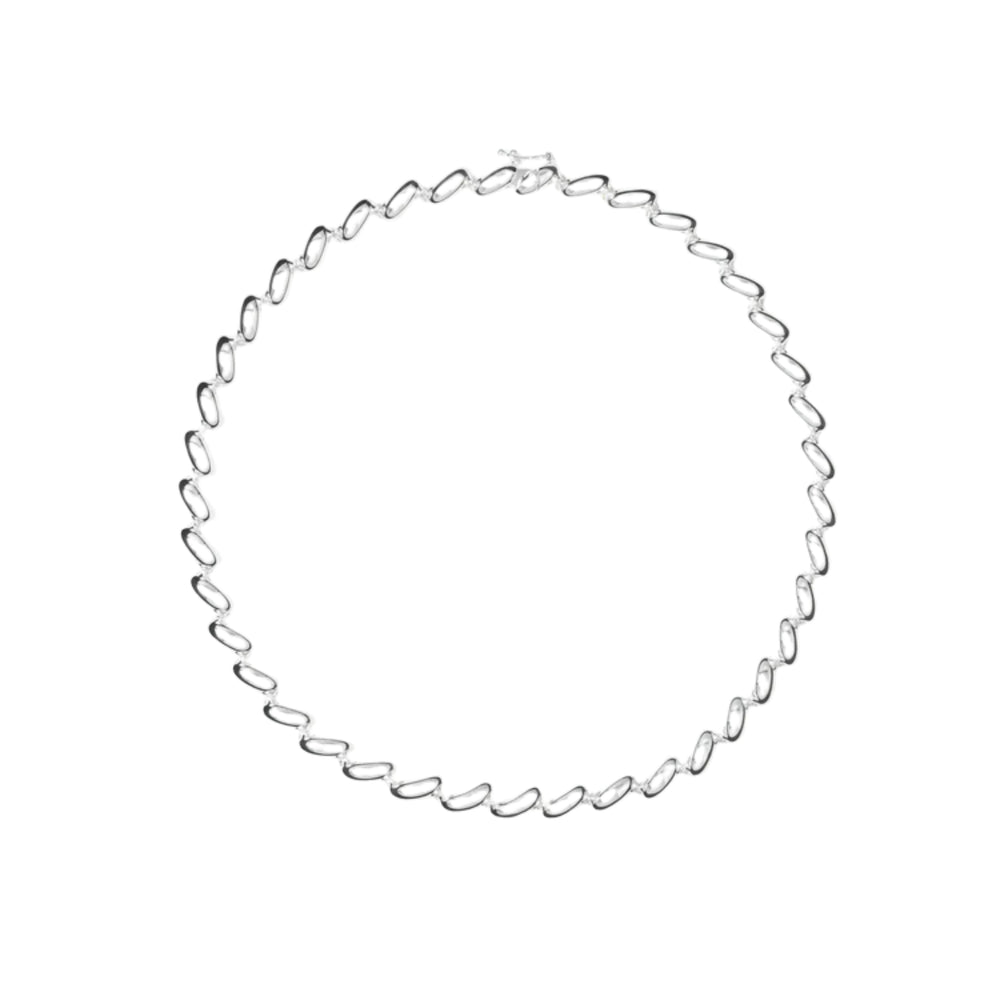 The Edith Necklace is characterized by subtle curve-shaped links crafted from 925 sterling silver-plated brass. The Edith Necklace features a discreet lock and ensures that the necklace beautifully surrounds your neck.
