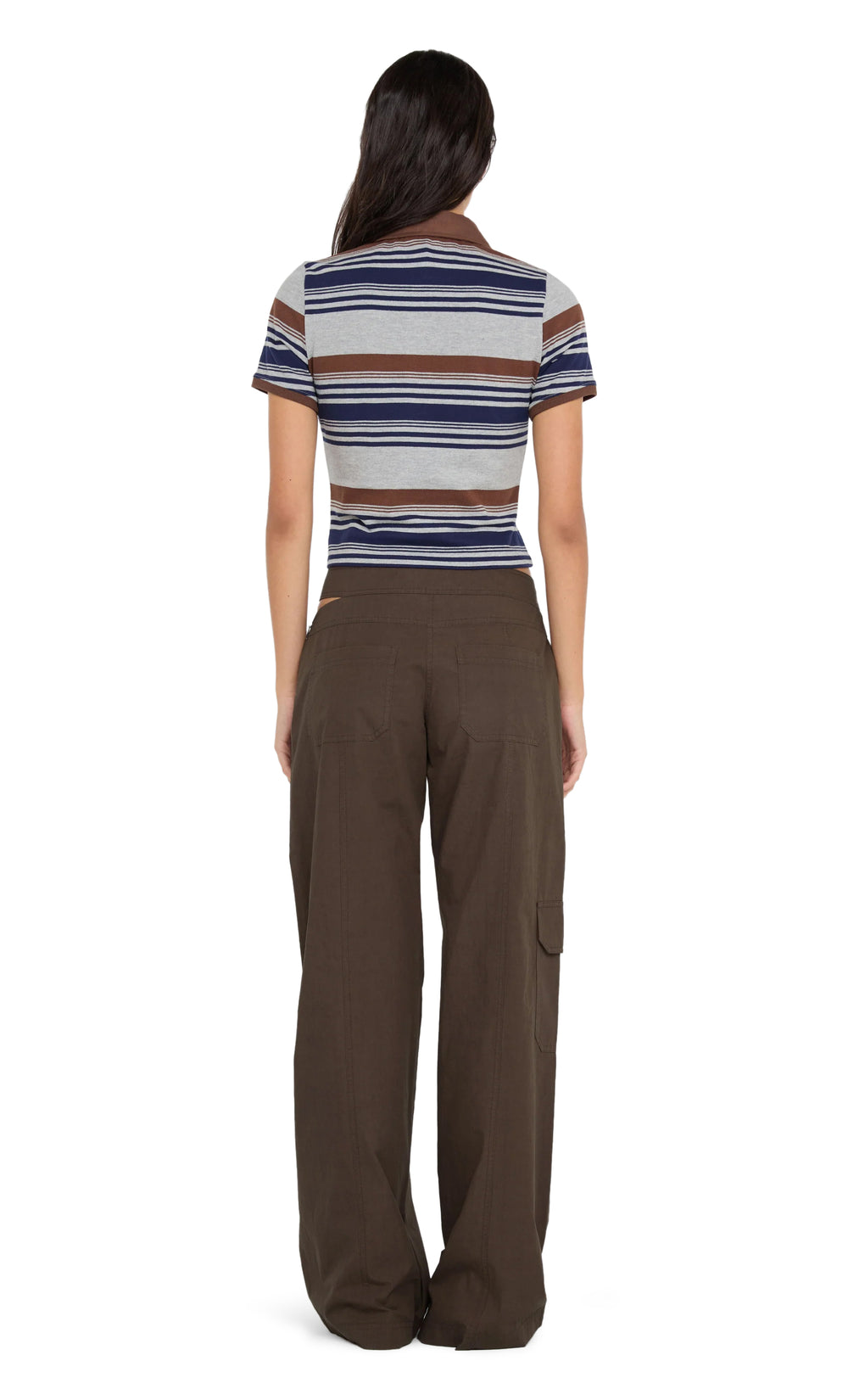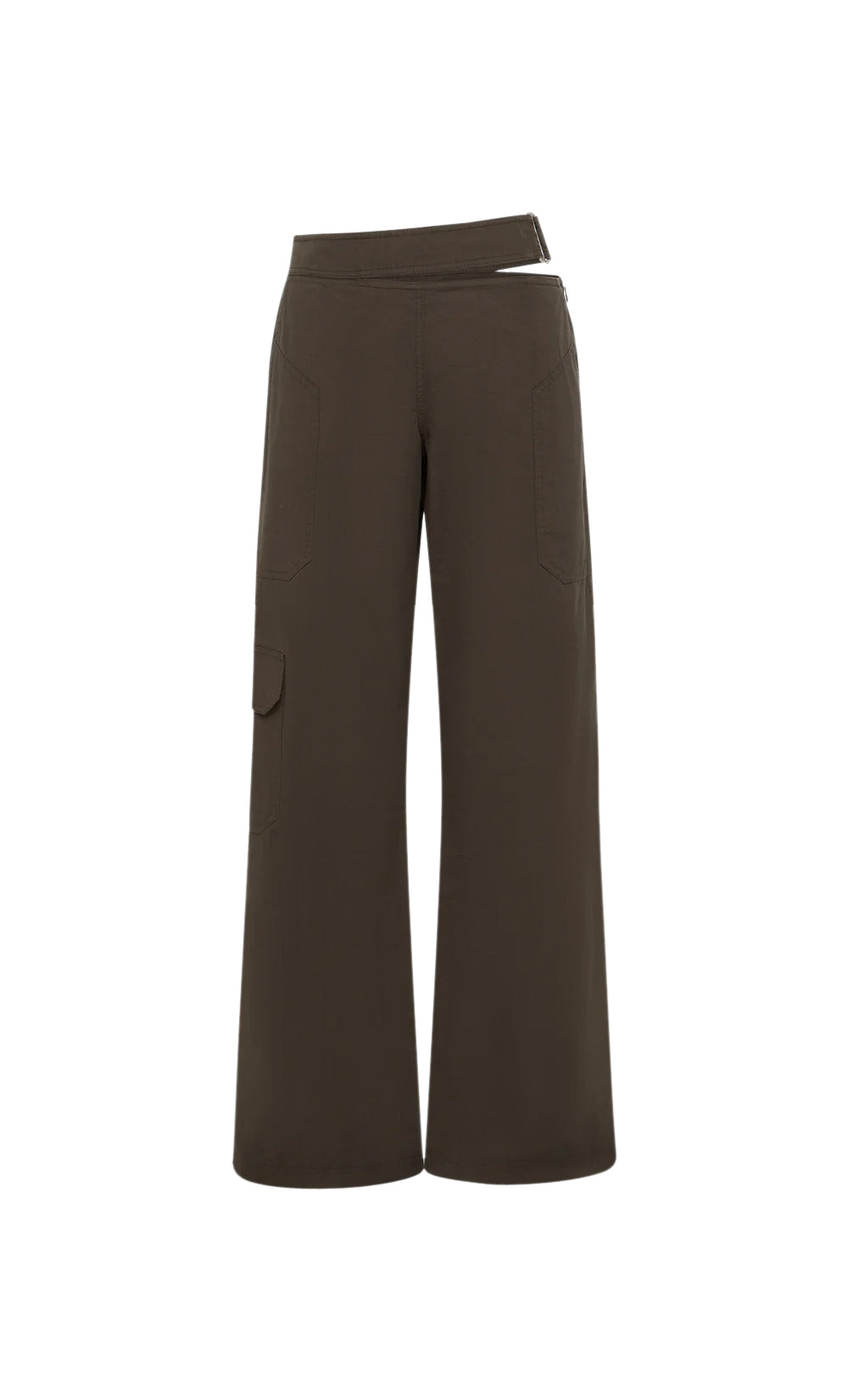 These chic straight-leg pants, crafted in a rich dark chocolate hue, feature a unique asymmetrical waistband, perfect for a modern and elevated look.