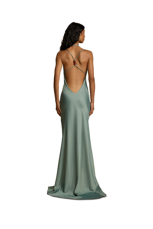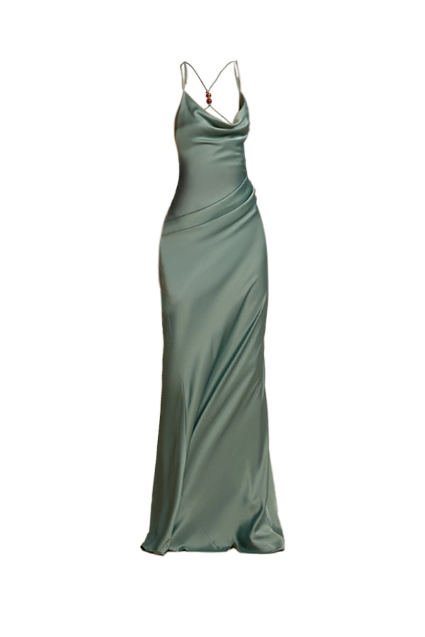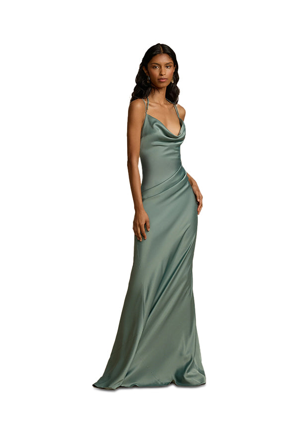 The Isodora Dress is an elevated maxi designed to captivate. Crafted in a muted teal tone, she features a flattering cowl neckline with an adjustable neck strap for versatility. Gentle tucks at the side hip enhance the silhouette, adding flattering definition. Finely finished with an alluring crossed back and resin bead detailing, Isodora is made for effortless summer elegance, all season long.