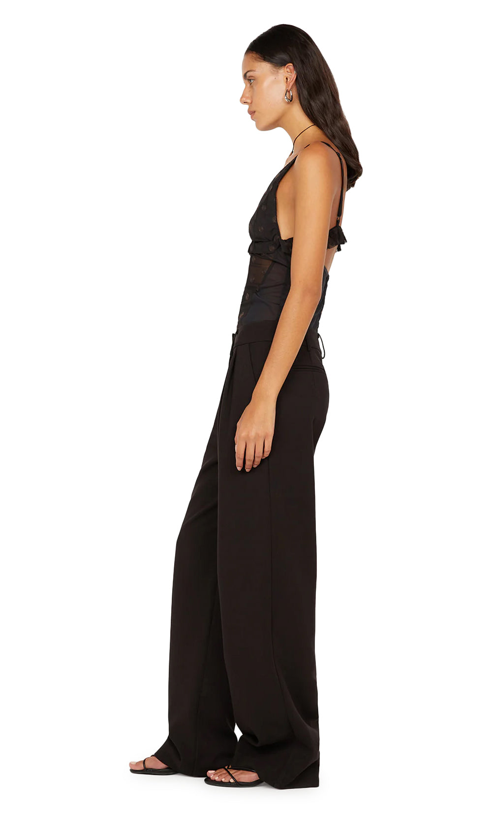 The Karla V Neck Top offers a chic update to the classic camisole. Featuring a rich Black and Chocolate colorway, this top showcases polka dot embroidered mesh with a flattering V-neck and lined bust. The silhouette is defined by an underbust seam with a delicate ruffle, a structured panelled midsection, and a contemporary raw hem.