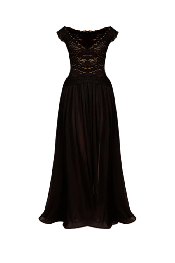 The long awaited Arabella dress, a romantic floor length silhouette made to leave a lasting impression. She is designed with an off-shoulder neckline complimenting the décolletage. A fitted lace bodice with wide straps add vintage inspired charm before it flows into a sheer skirt that is draped from the waistline, cascading into a delicate back tie. The Arabella dress combines timeless sophistication with modern allure.