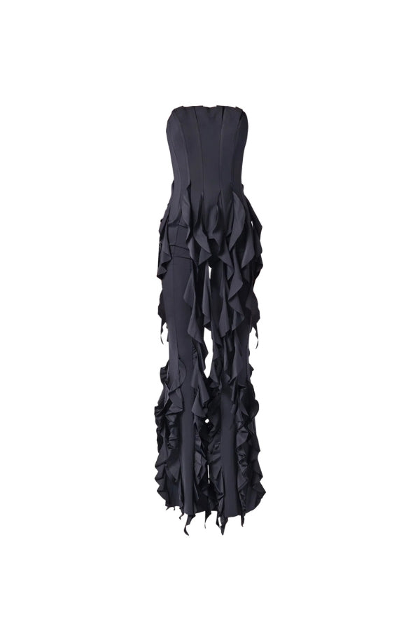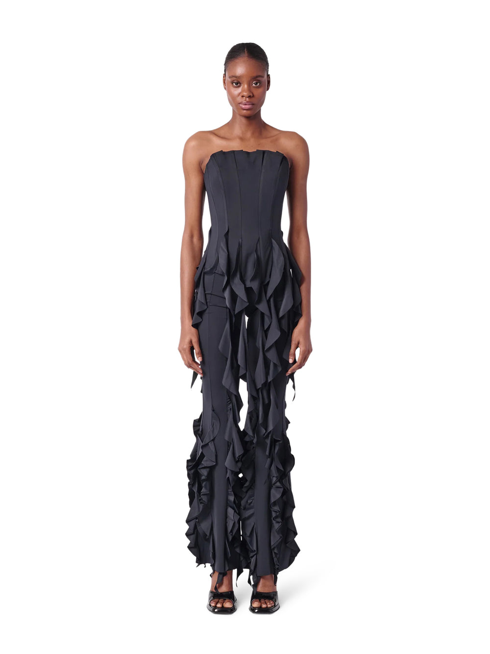 Dive in and make a splash with the Calamity Corset. Pleated panelling detail and boning channels to give that waist trainer look. The Calamity Corset is made from recycled lycra, including the cascading draped ruffles. A centre-back Zip fastens the corset and uses a hook and eye at the top for easy closure.
