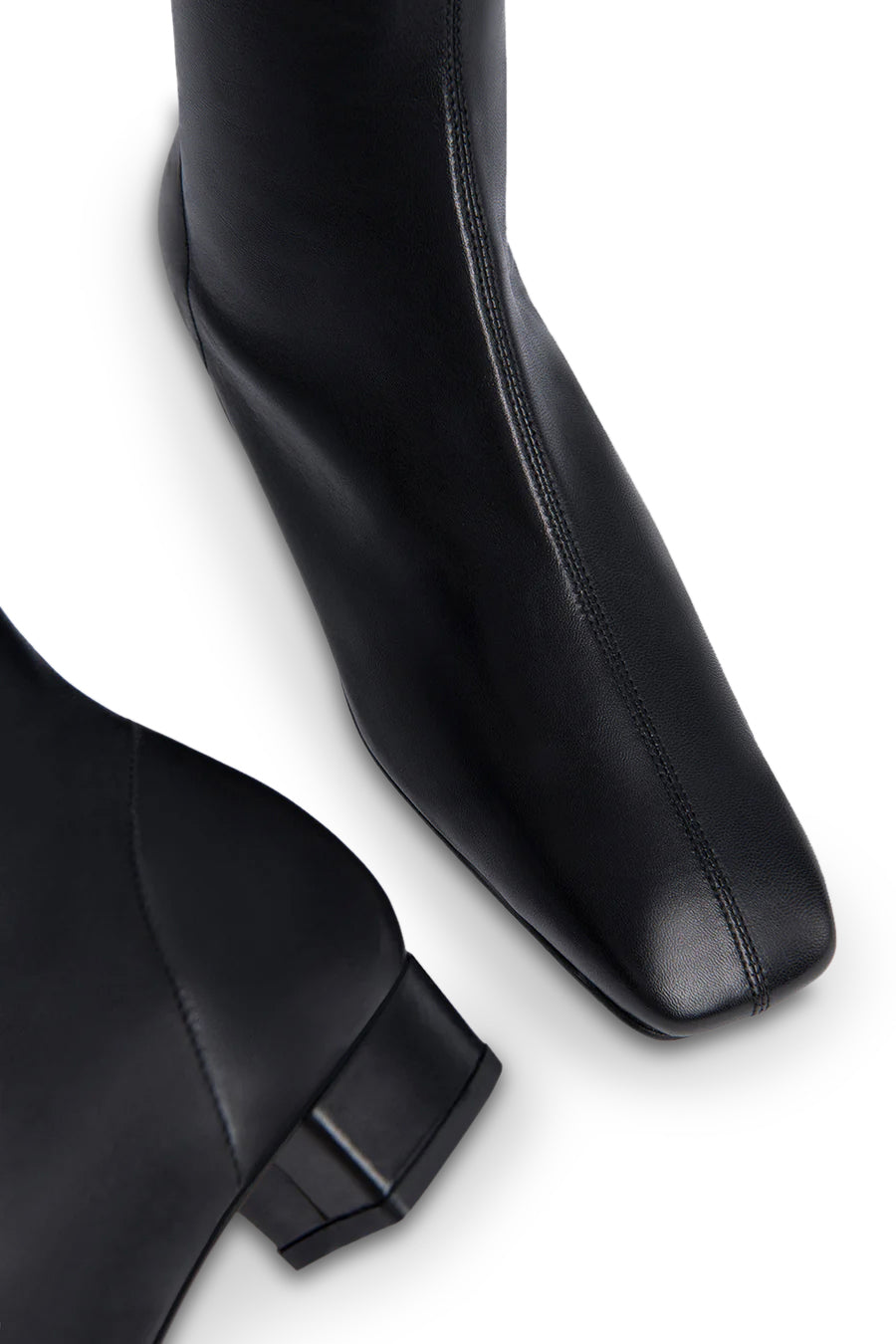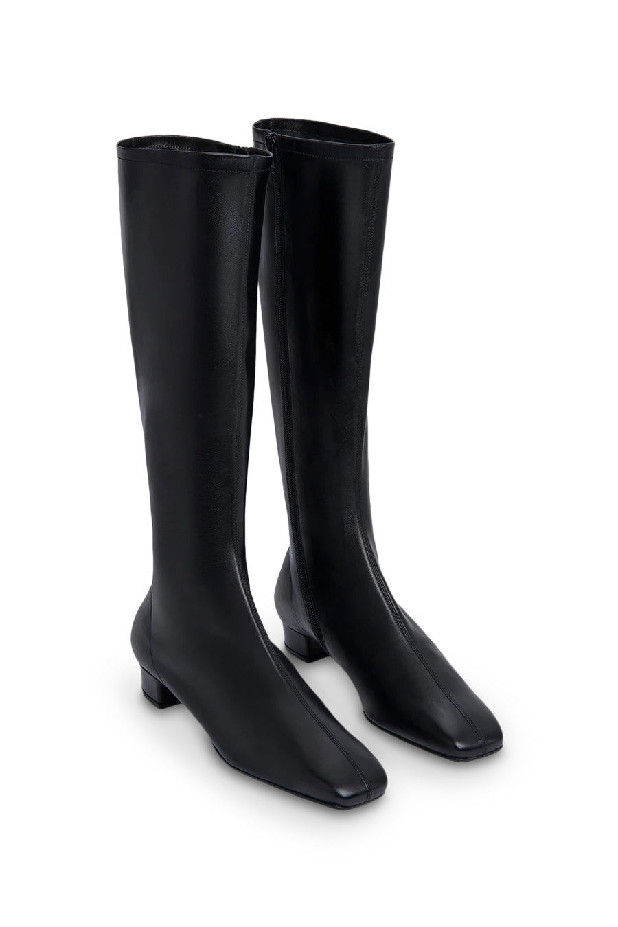 Leather knee-high boots crafted from smooth Italian cowhide, featuring a glove-like fit and a leather-covered block heel (3 cm). Designed with a side zip closure, square toe and made from LWG-certified leather.