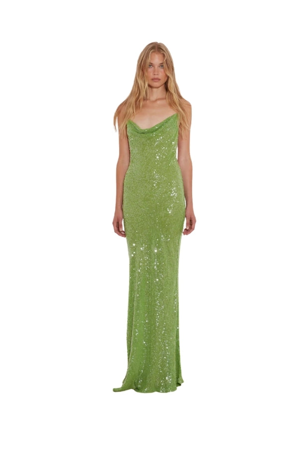 Made to mesmerise, Gaia turns a 90s slip into high-voltage glamour. Drenched in sequins that catch the light and in a fresh shade of green, it skims the body with a cowl neck, low back and barely-there straps.