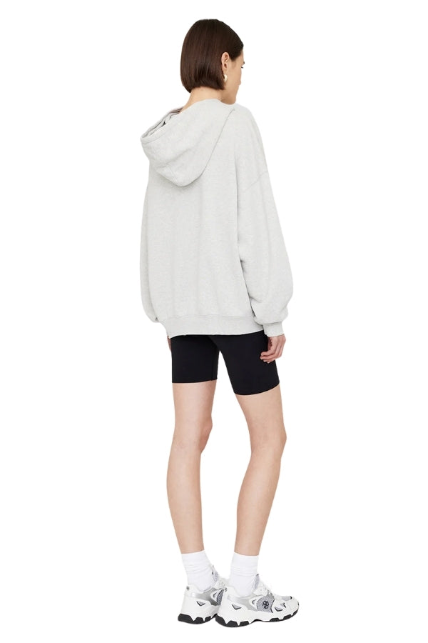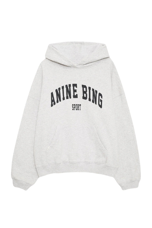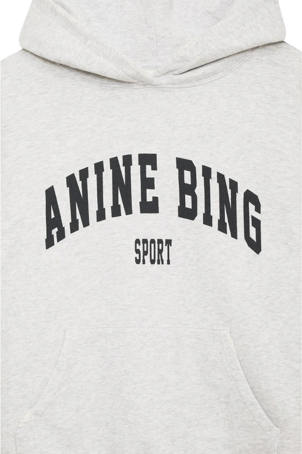 The Harvey Sweatshirt is an oversized hoodie made from midweight 100% cotton fleece in heather grey. It features an ANINE BING Sport graphic at the chest in authentic collegiate lettering and subtle grinding along the edges of its hood, sleeve cuffs, and waistband for a vintage-inspired look. Includes a functional front kangaroo pocket.
