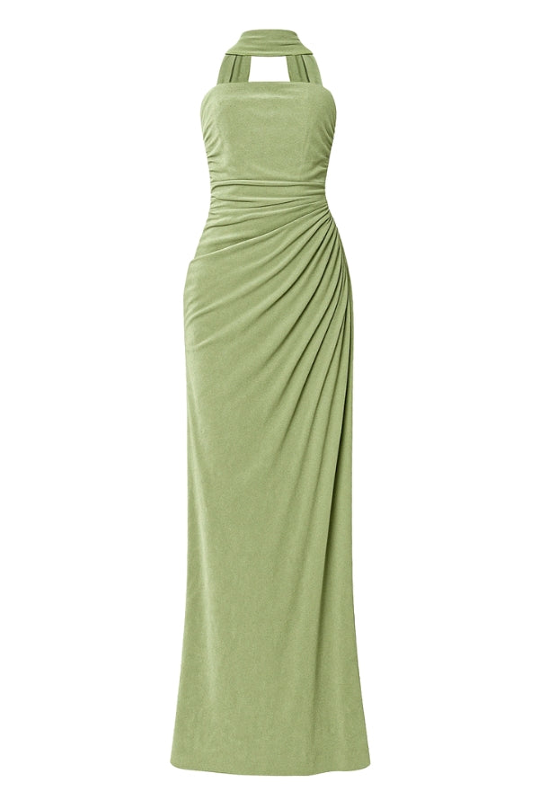 The Kahlia dress in sage green exudes understated luxury, crafted from a slinky textured lycra that glides effortlessly over the body. Featuring a bandeau neckline and gathering throughout. A hidden internal corset structure provides added support and shape, enhancing the fit while maintaining a seamless finish. The softly draped, sarong-inspired detail at the waist adds dimension and elegance, complemented by a thigh-grazing slit that offers a subtle touch of allure.