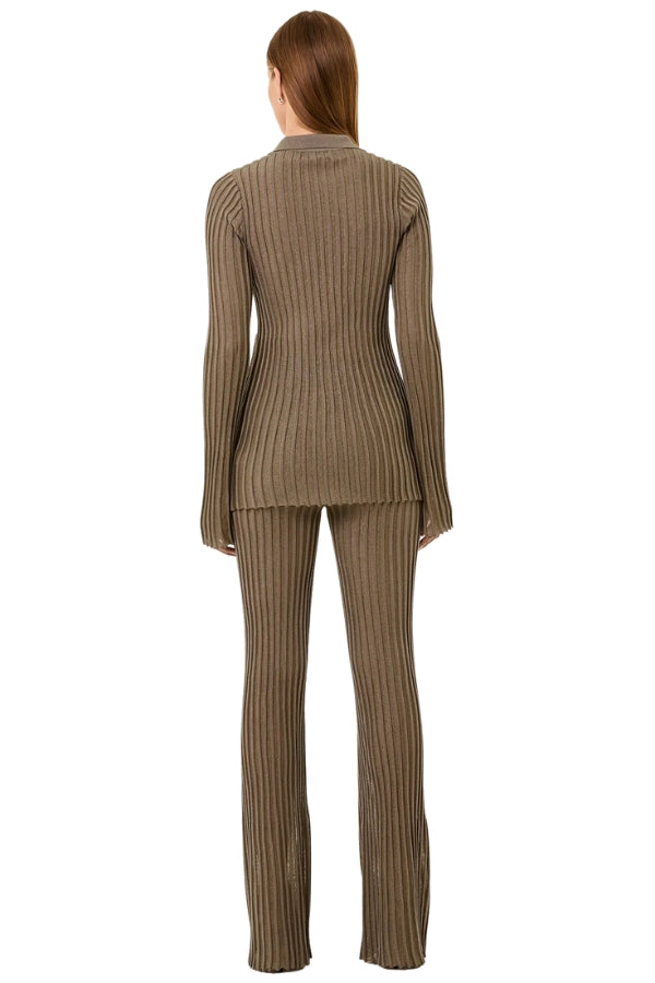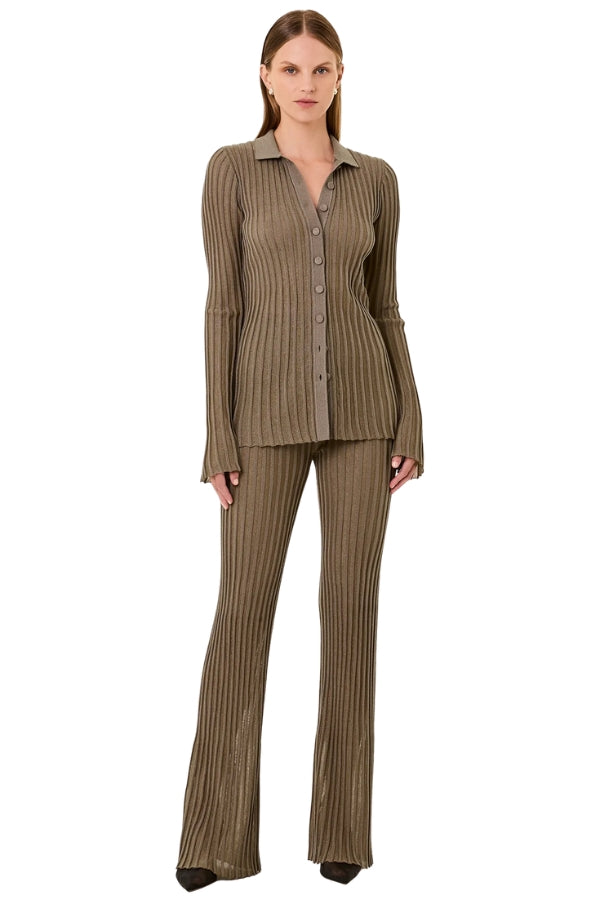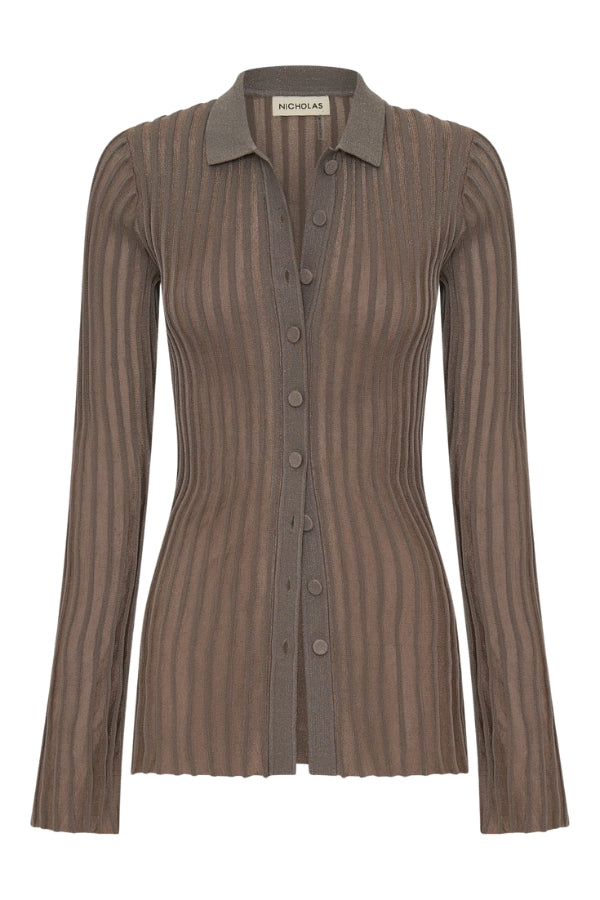 The product elevates everyday knitwear with a stretch knit fabric woven with a subtle lurex thread throughout for a touch of shimmer. This button-down top is detailed with covered buttons for a clean and cohesive finish, blending comfort with understated glamour.