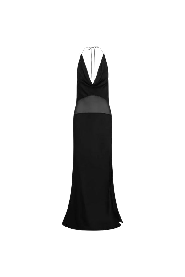 Introducing the Orchid dress, a timeless wardrobe icon that radiates dark glamour. With a fluid silhouette that sweeps to the floor and skims the body, it's crafted from contrasting panels of lightweight satin and semi-sheer georgette. The daringly cut back is finished with knotted detailing and delicate ties, while the plunging cowl and slit skirt perfectly balance elegance and seduction.