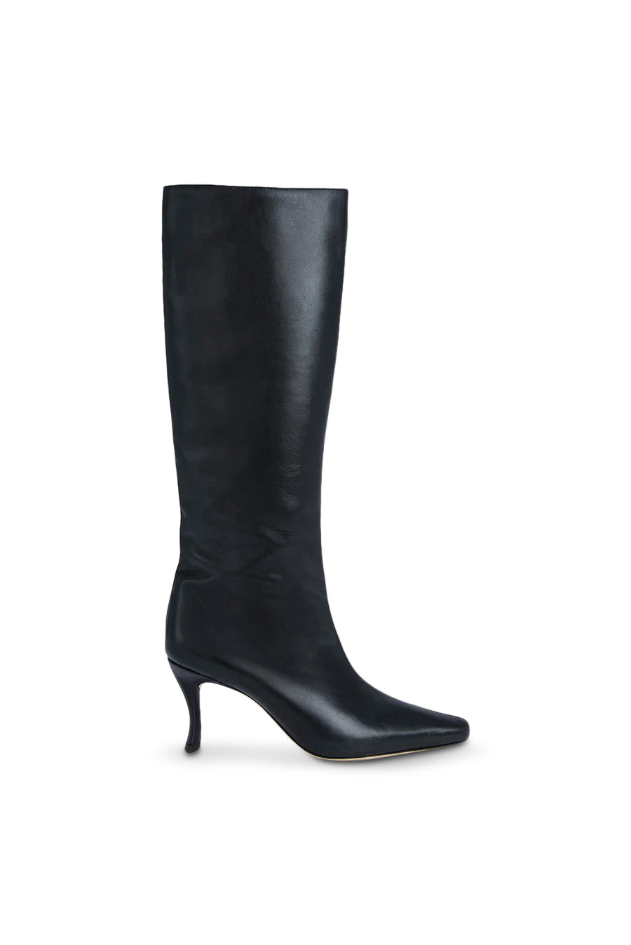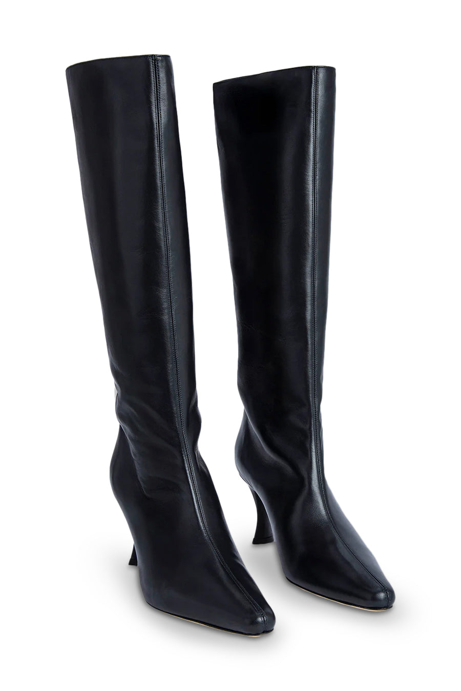 Smooth calf leather knee-high boots with pull-on design, featuring angular 8cm leather-covered heel and an almond toe.