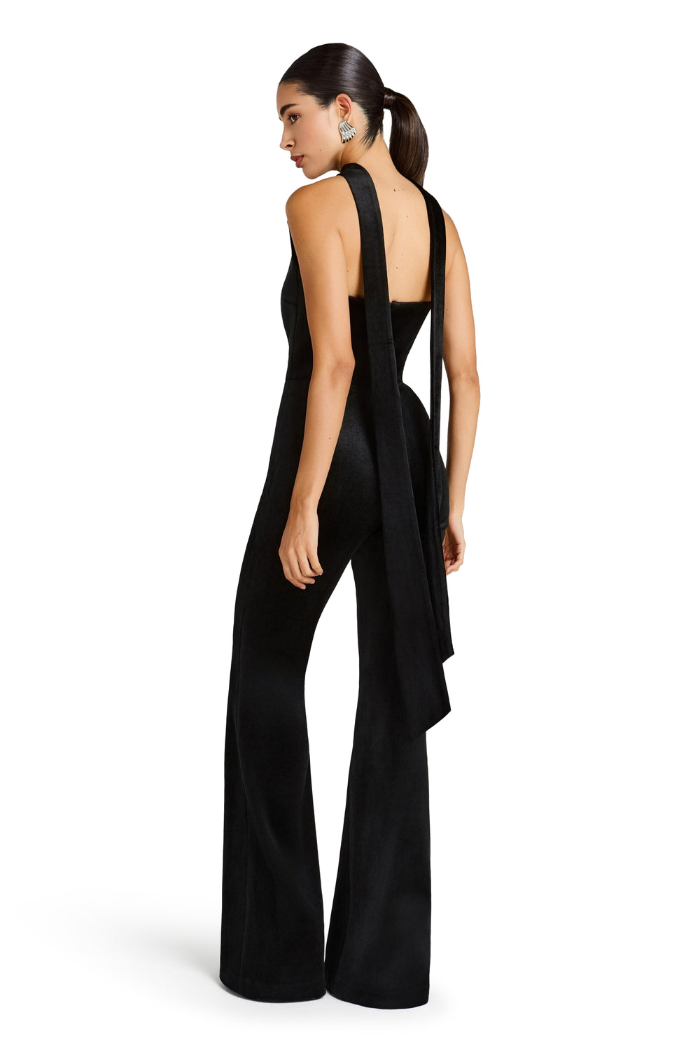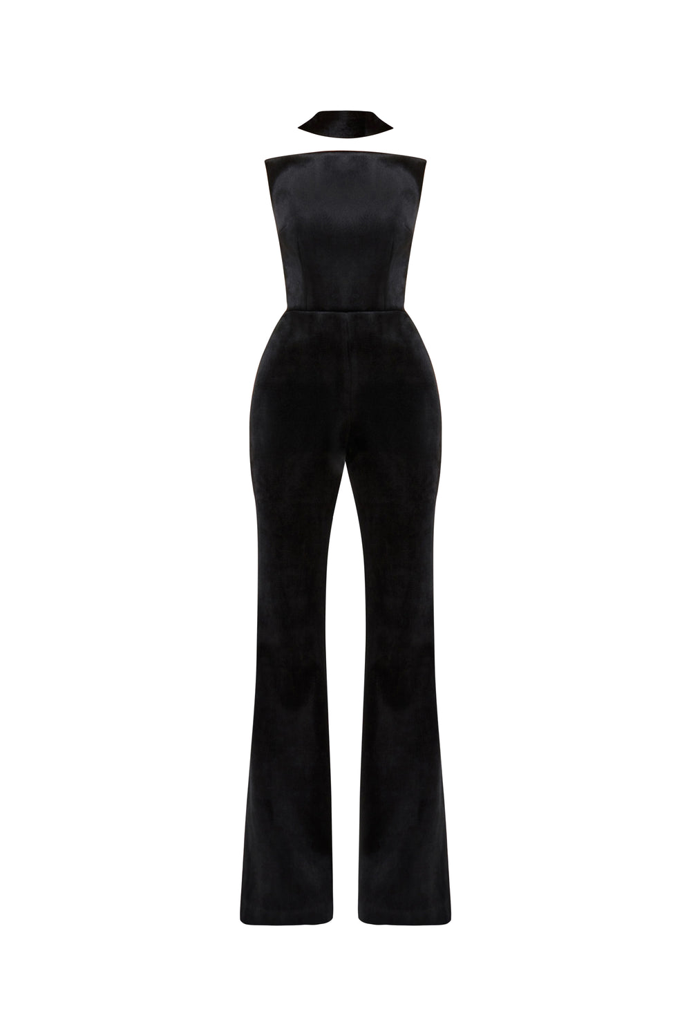 for a smooth fit. The TALIA Black Jumpsuit comes with an optional neck sash in the matching velvet fabrication for adaptable elegance.