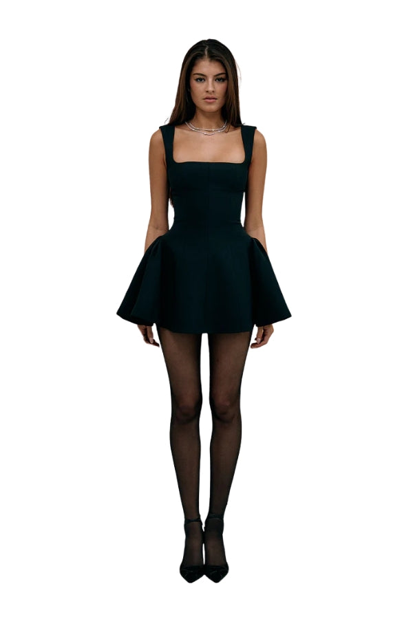 Square neck mini dress made of silk, with godets to accentuate the waist and hips with a zipper and hook and eye center back closure.