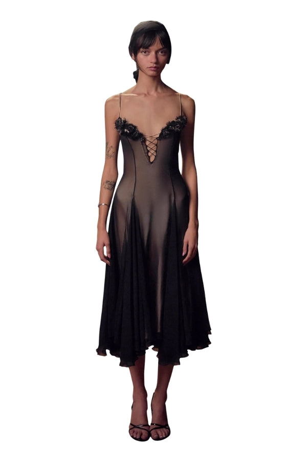 A silk chiffon sheer dress featuring meticulously handcrafted floral detailing, individually placed on the bust. Complemented by 1/8-inch chiffon crisscrossed straps at the center of the bust. Each dress showcases a unique motif, reminiscent of a bouquet of roses. Dress comes with a complete separate lining and can be worn with or without. Includes and center back zipper.